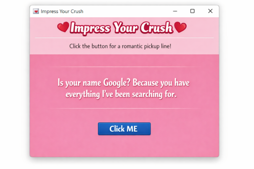 Every time the button is pressed, the program will show a new pickup line chosen at random. You can also tweak or replace the lines to match your own personality and taste. This little feature adds humor and creativity, helping you impress your crush in a fun and playful way. 😄💖